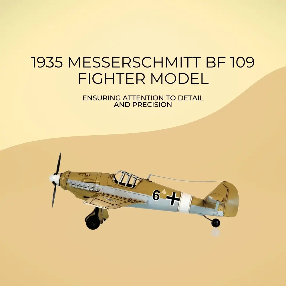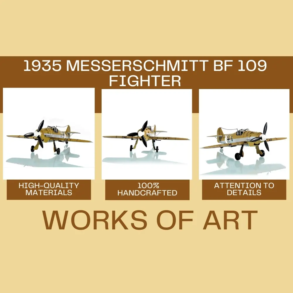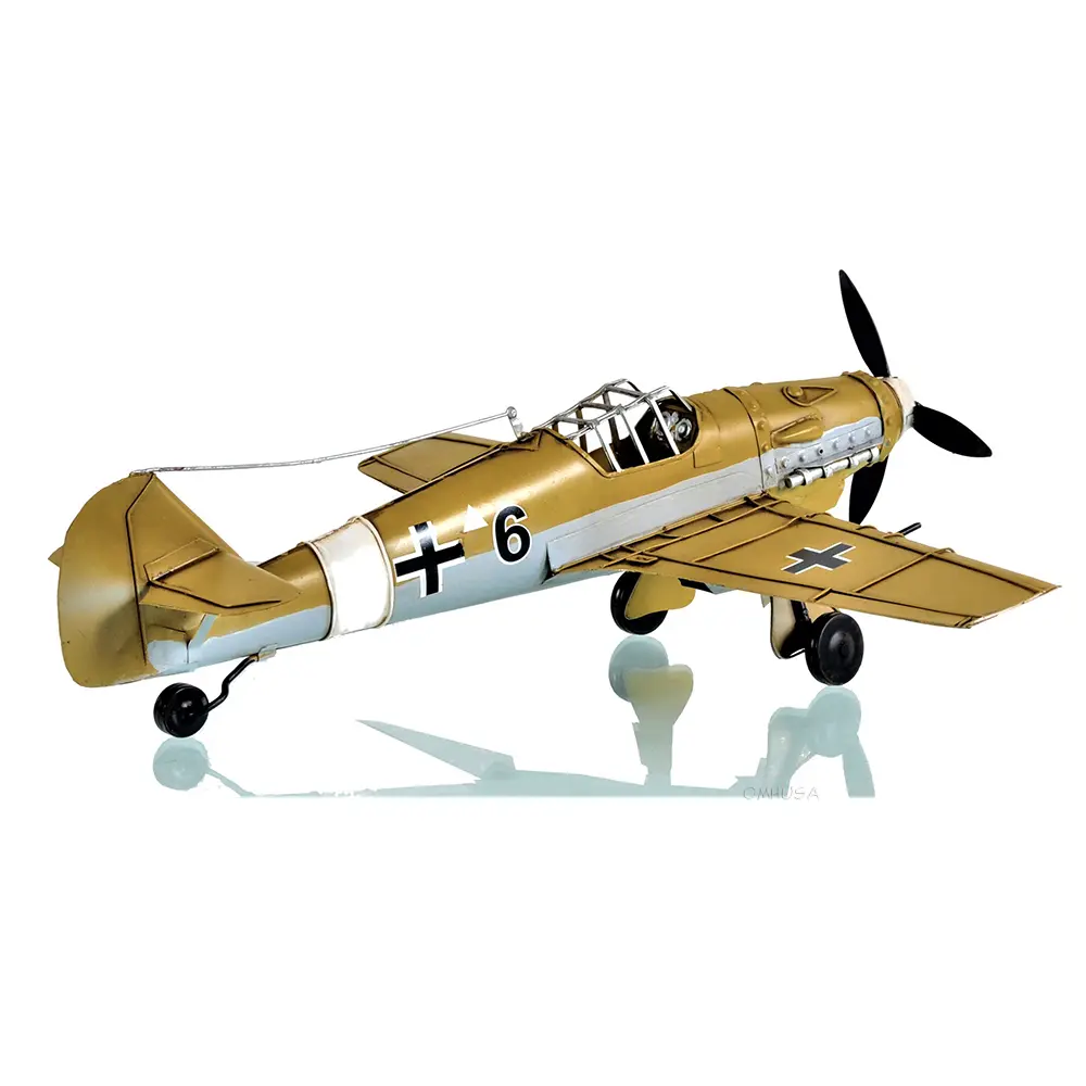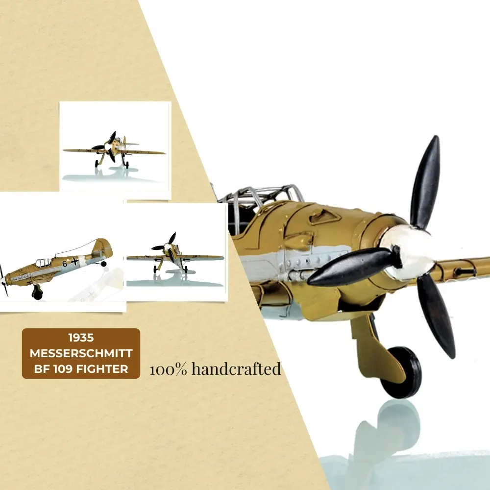 - Intricate Detailing: Meticulously handcrafted from iron, this model captures the essence of the iconic Messerschmitt Bf-109, featuring detailed mock wing cannons and rotating gears.