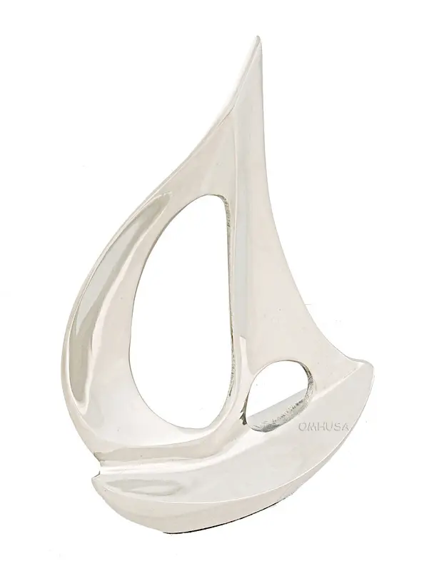 An aluminum sailboat that gives an artistic appeal to its contemporary design. The silhouette decor piece adds a little sparkle to any part of the home or office. Made out of aluminum with a shiny nickel finish.
