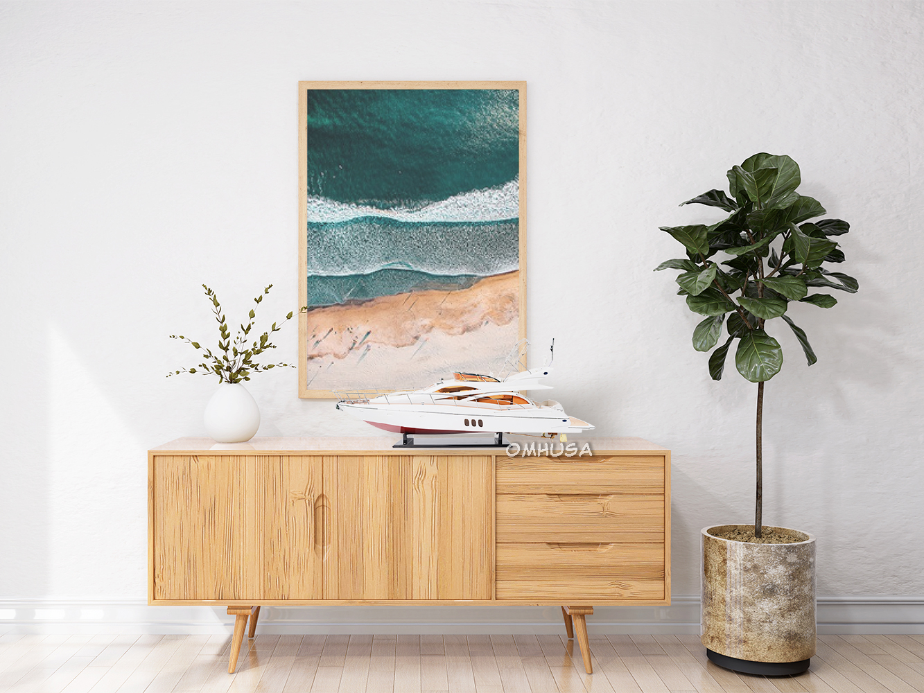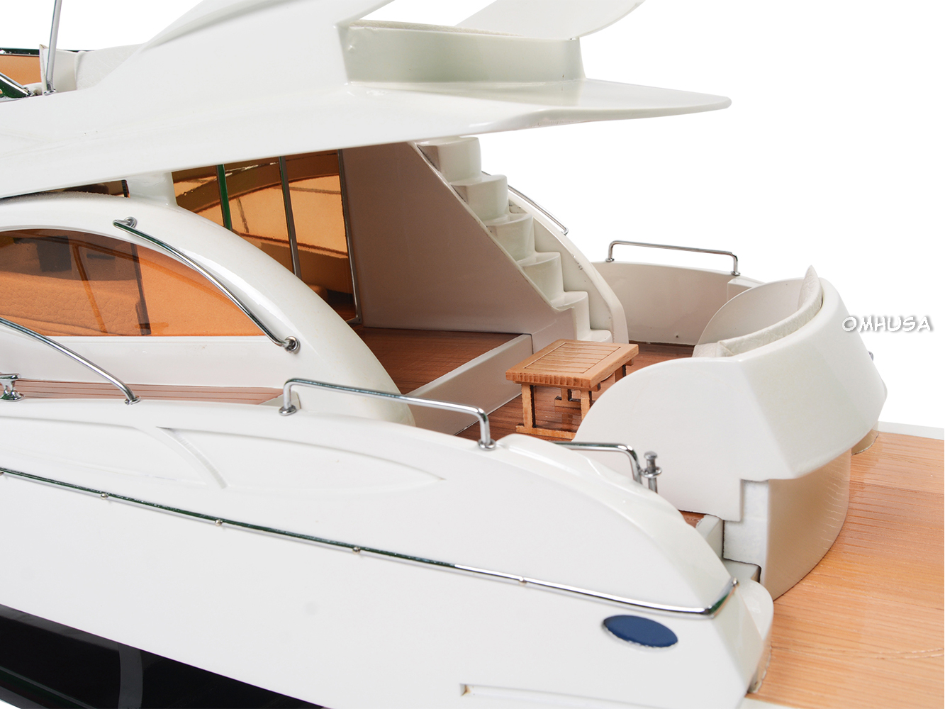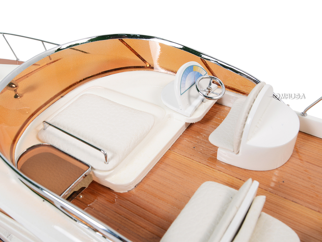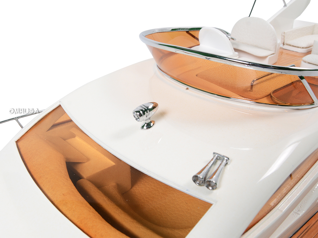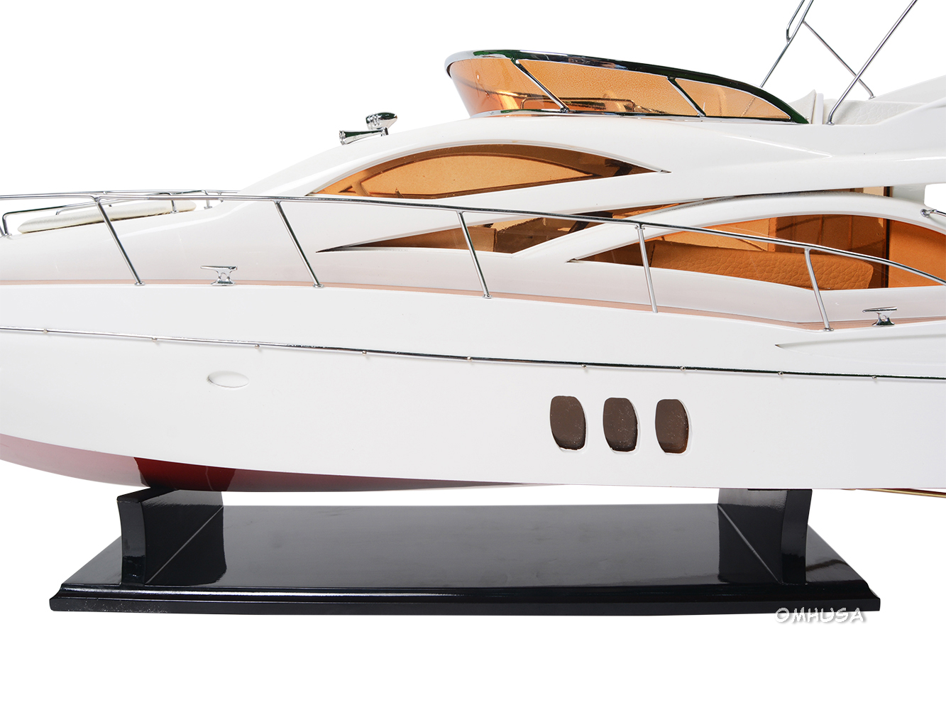 Our luxurious Manhattan 64 Sunseeker is handcrafted from beautiful wood such as rosewood, mahogany, teak and along with various exotic wood. It is then painted in two tone colors with an outer coat of clear vanishes. The hull is constructed using plank on frame method, each strip of exotic wood are carefully join together to form a smooth hull. Our Manhattan 64 Sunseeker has eye catching details such as the glossy white interior color, tinted windshield, metal rail surrounding the cruiser, etc. All these detailed ornaments contribute to a stunning wooden Manhattan 64 Sunseeker. A detachable wooden stand comes standard on this model. The model is completely hand built by skillful and creative master craftsmen; you will be amazed at how real it looks. Our Manhattan 64 Sunseekerwas built according to scale through original plans, pictures and drawings. This model is shipped fully-assembled and ready for display.