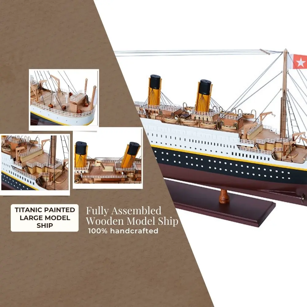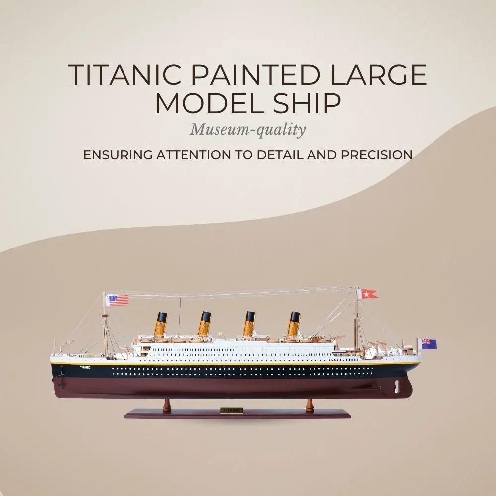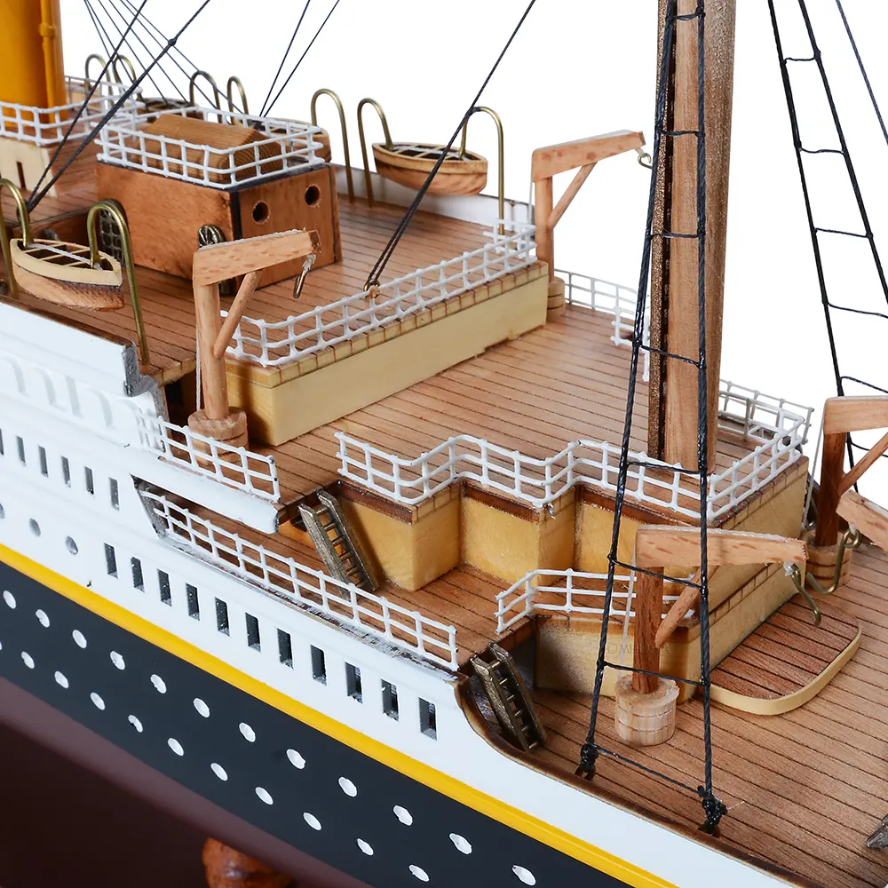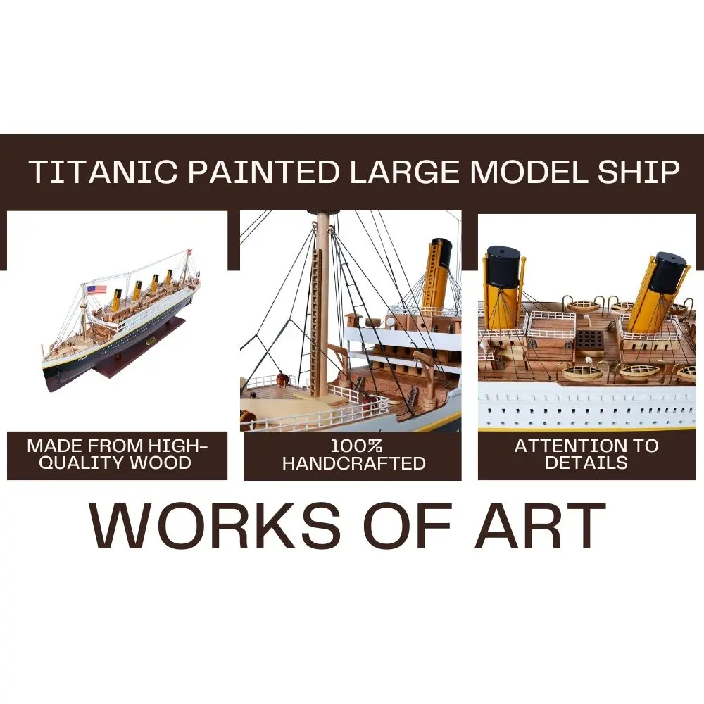 The model is painted in red, black, and white to represent the original colors of Titanic. You can find hundreds of intricate details on this model. All lifeboats are meticulously handcrafted from wood. All riggings are accurately built according to scale. The intricate pieces such as: the crane, anchors, stanchions, windows, ladders, steam pipes, and skylight really make this model a master piece.