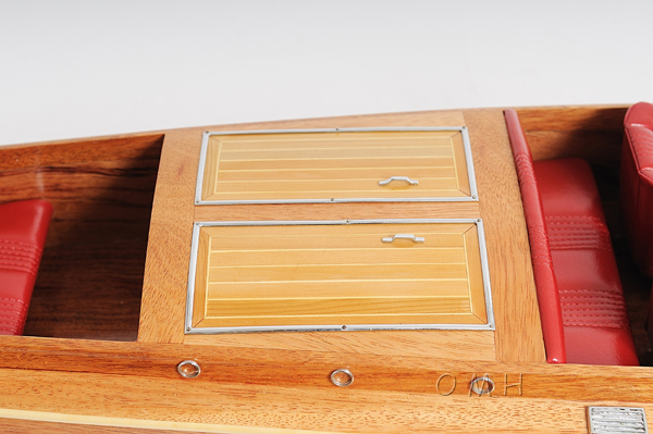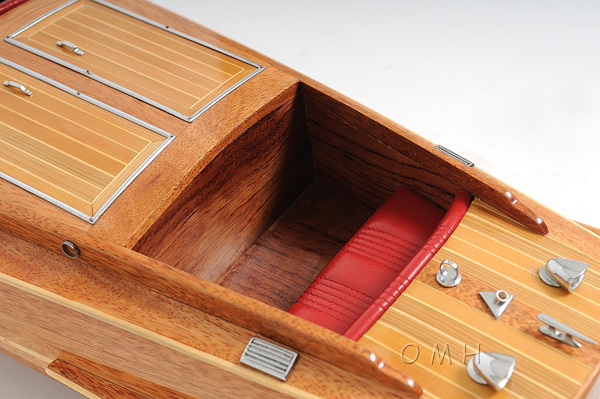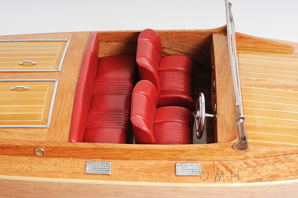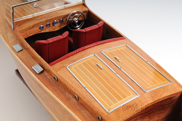 Our Chris Craft Runabout model was handcrafted from mahogany & western red cedar. The hull was constructed using plank on frame method. Each strip of exotic wood was carefully joined together. This model was completely hand built to spec by skillful and creative master craftsmen.