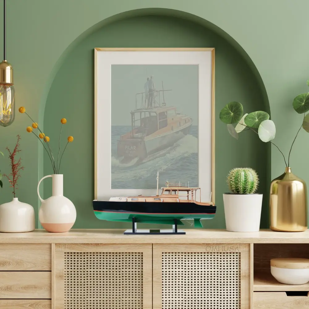 The Hemingway pilar boat comes with a sturdy wooden stand, ready for display right out of the box. To showcase this remarkable piece, place it in a spacious area such as a living room, office, or study where its intricate craftsmanship can be fully appreciated.