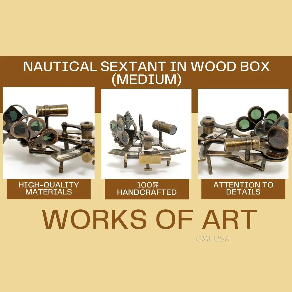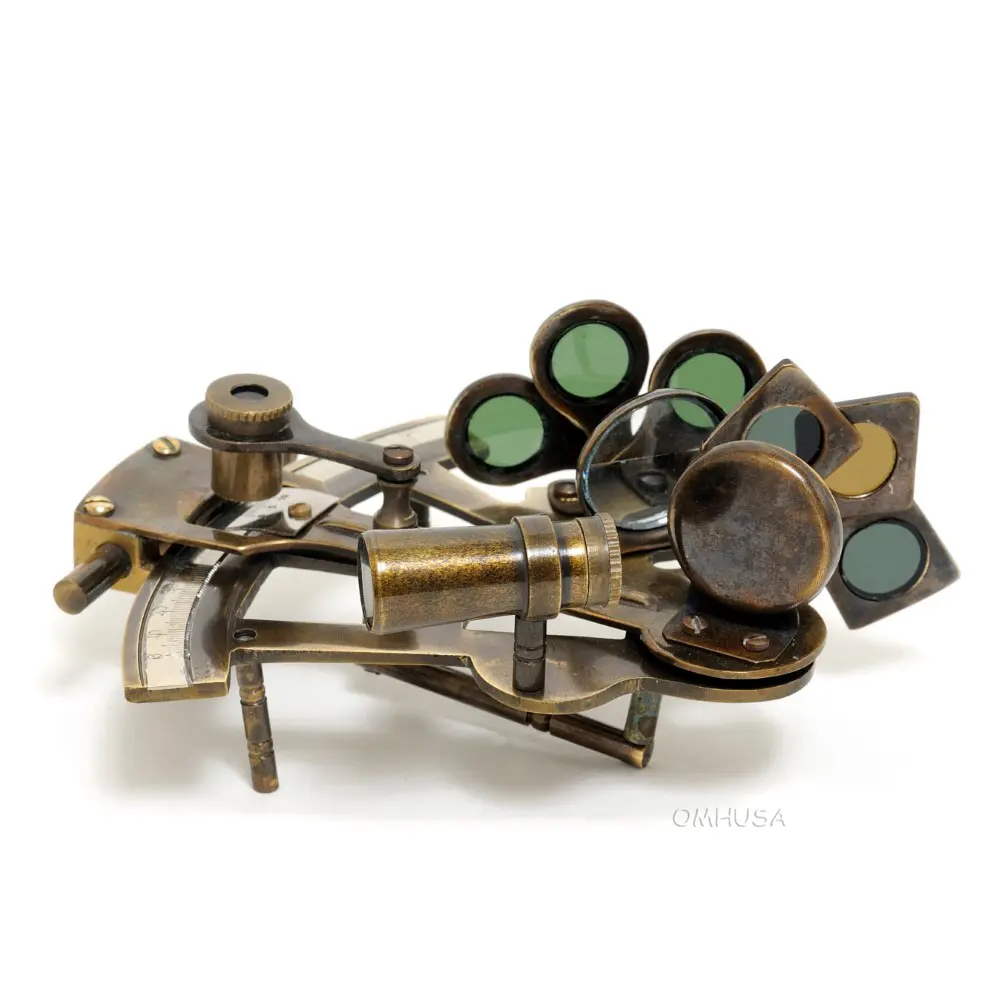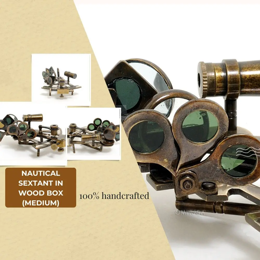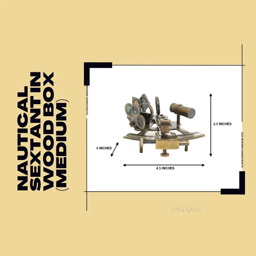 This is a fully functional nautical sextant. It is made of high quality brass. Each component is crafted with the finest craftsmanship. Available in antique brass finish and it comes in a beautiful rosewood gift box. This sextant is a great addition to any nautical collection. The item dimensions are: L: 4.5 inches, W: 4 inches, H: 2.5 inches.