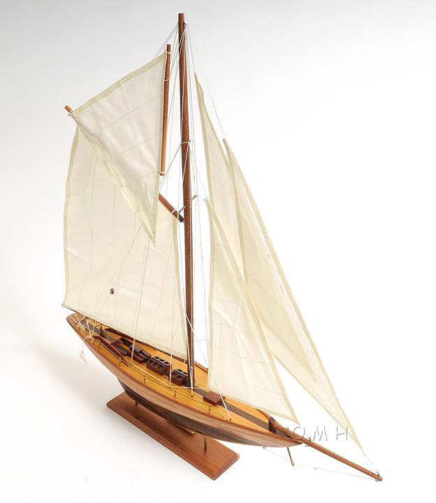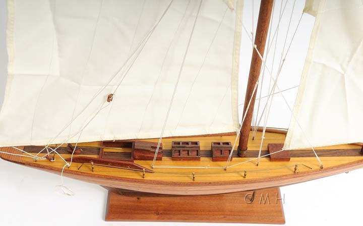 This model hull is handcrafted from strips of wood using plank on frame construction method. The deck is made from many strips of wood. There are various details on the deck such as hatches, winches, and cabin. One can also locate a metal filter on the deck near the companionway. The stitched sail and intricate rigging complete the definition of a true sailing boat.
